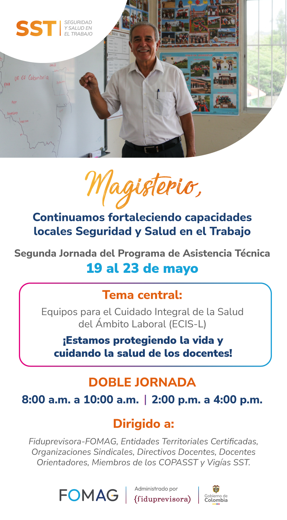 Habiendo terminado el Primer Módulo del Programa en el mes de Abril, los invitamos a la segunda asistencia técnica en Seguridad y Salud en el Trabajo que tiene como tema central las funciones y responsabilidades de los Equipos para el Cuidado Integral de la Salud del ámbito laboral ECIS-L. Este segundo Módulo se realizará en doble jornada (8:00 a.m. -10:00 a.m. - 2:00 p.m. - 4:00 p.m.) el día miércoles 21 de mayo del año en curso, para facilitar la participación de los Docentes Activos, Docentes Orientadores, Directivos Docentes y miembros del Comité Paritario de Seguridad y Salud en el Trabajo y Vigías de Seguridad y Salud en el Trabajo