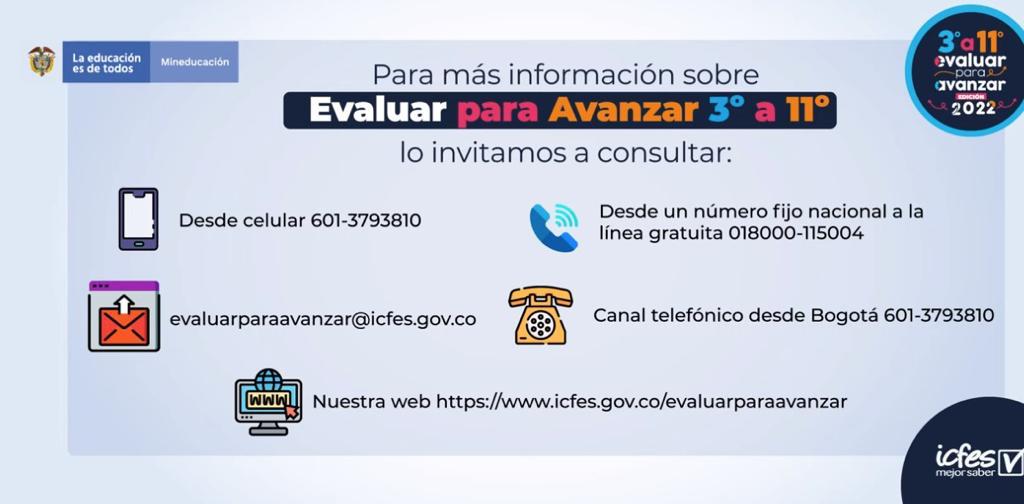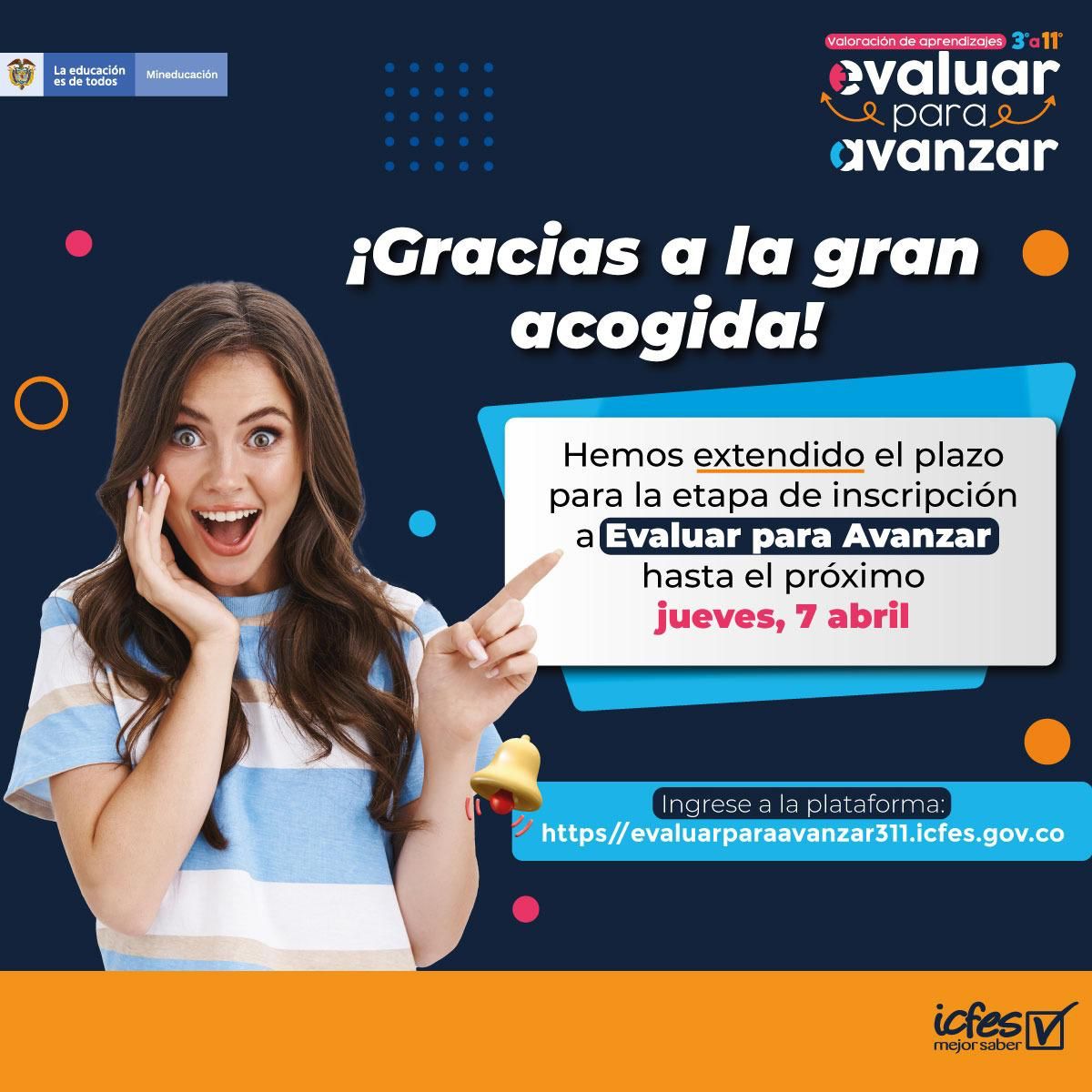 El plazo para la inscripción de los estudiantes en Evaluar para Avanzar se amplia hasta el 07 de abril de 2022....por lo tanto, los exhortamos al cumplimiento de la inscripción de los estudiantes...pueden ver los tutoriales y cualquier queja, reclamo, solicitud, escribir al ICFES y enviar copia a la SED al correo calidadeducativa@sedcordoba.gov.co para que desde acá también presionemos las respuestas efectivas....