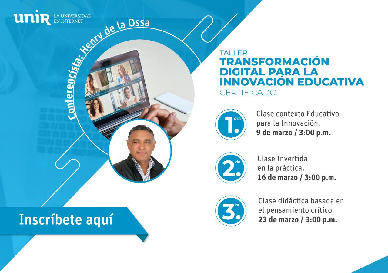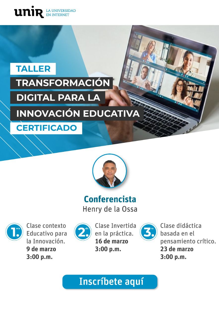 La Secretaría de Educación Departamental en Convenio con UNIR convoca a los docentes a inscribirse y participar en el Taller Transformación Digital para la Innovación Educativa, conferencista Henry de la Ossa. Las inscripciones estarán abiertas hasta el 7 de marzo de 2022 y se llevarán a cabo tres (3) sesiones de trabajo como lo indica la circular adjunta.