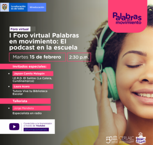 El Ministerio de Educación Nacional y el Centro Regional para el Fomento de la Lectura en América Latina y el Caribe – CERLALC, los convocan al primer Foro Virtual “PALABRAS EN MOVIENTO” EL PODCAST EN LA ESCUELA.