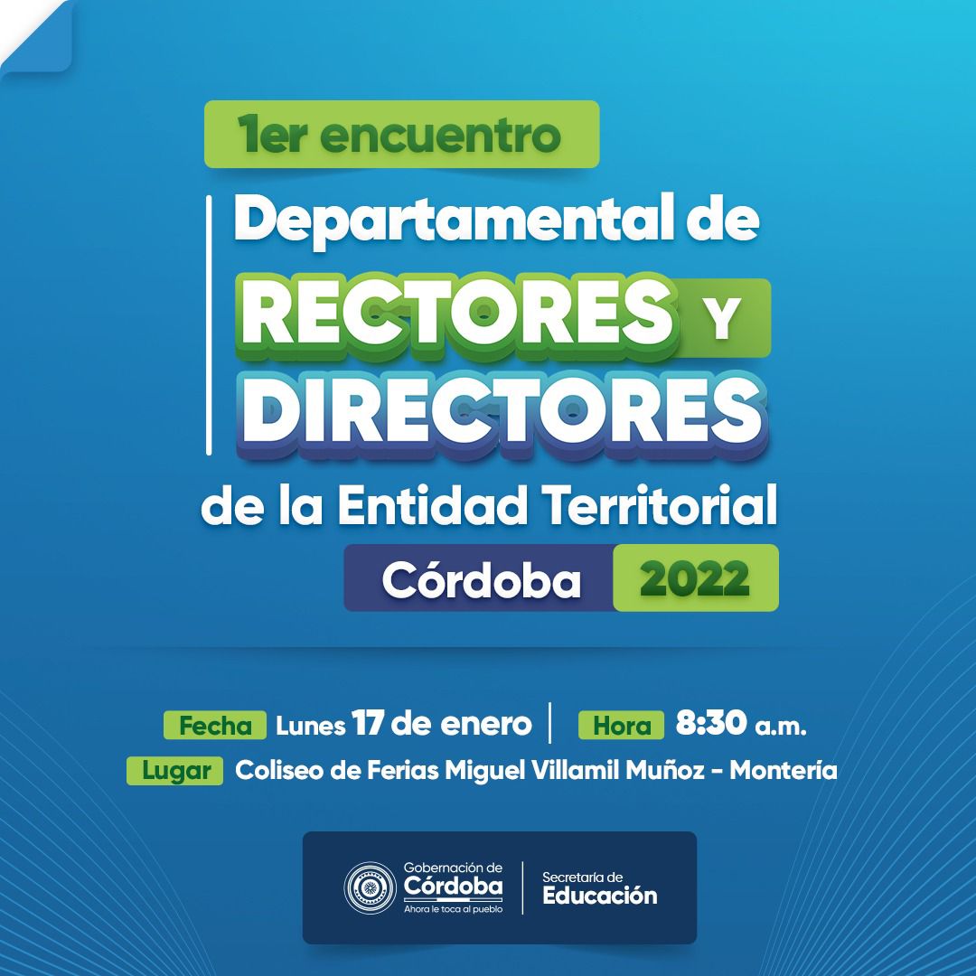 Invitamos a todos los Rectores y Directores de la Entidad Territorial Córdoba, asistir a nuestro Primer Encuentro Departamental. En este espacio queremos compartir y socializar el nuevo año académico para poder avanzar en calidad educativa.