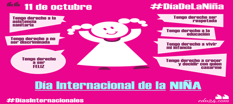Es importante informar que la Asamblea General de las Naciones Unidas adoptó la Resolución 66/170 para declarar el 11 de octubre como Día Internacional de la Niña, para reconocer los derechos de las mismas y los difíciles retos a los que se enfrentan en todo el mundo, así como promover su empoderamiento y la garantía de sus derechos. Estas fechas Internacionales nos dan la oportunidad de sensibilizar al público en general sobre temas de gran interés tales como los derechos humanos y además batallar situaciones de violencia contra las niñas, mujeres, abusos y maltratos tanto físicos como psicológicos.