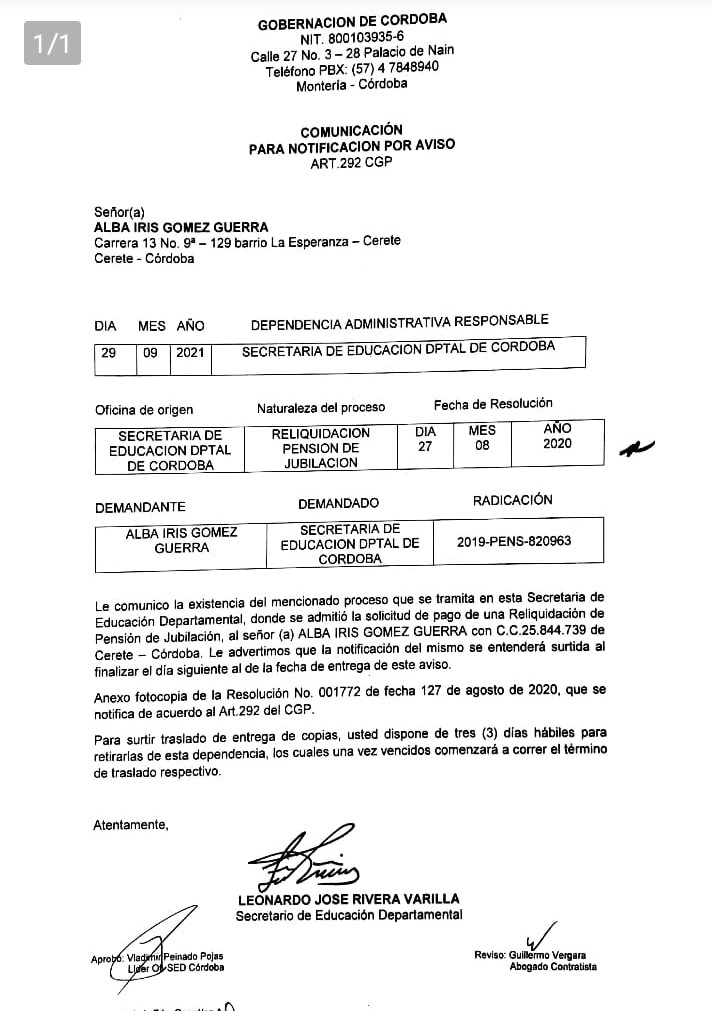 Le comunico la existencia del mencionado proceso que se tramita en esta Secretaría de Educación Departamental , donde se admitió la solicitud de pago de una reliquidación de pensión de jubilación, a la señora ALBA IRIS GÓMEZ GUERRA con cédula 25.844.739 de Cereté – Córdoba. Le advertimos que la notificación del mismo se entenderá surtida al finalizar el día siguiente al de la fecha de entrega de este aviso.