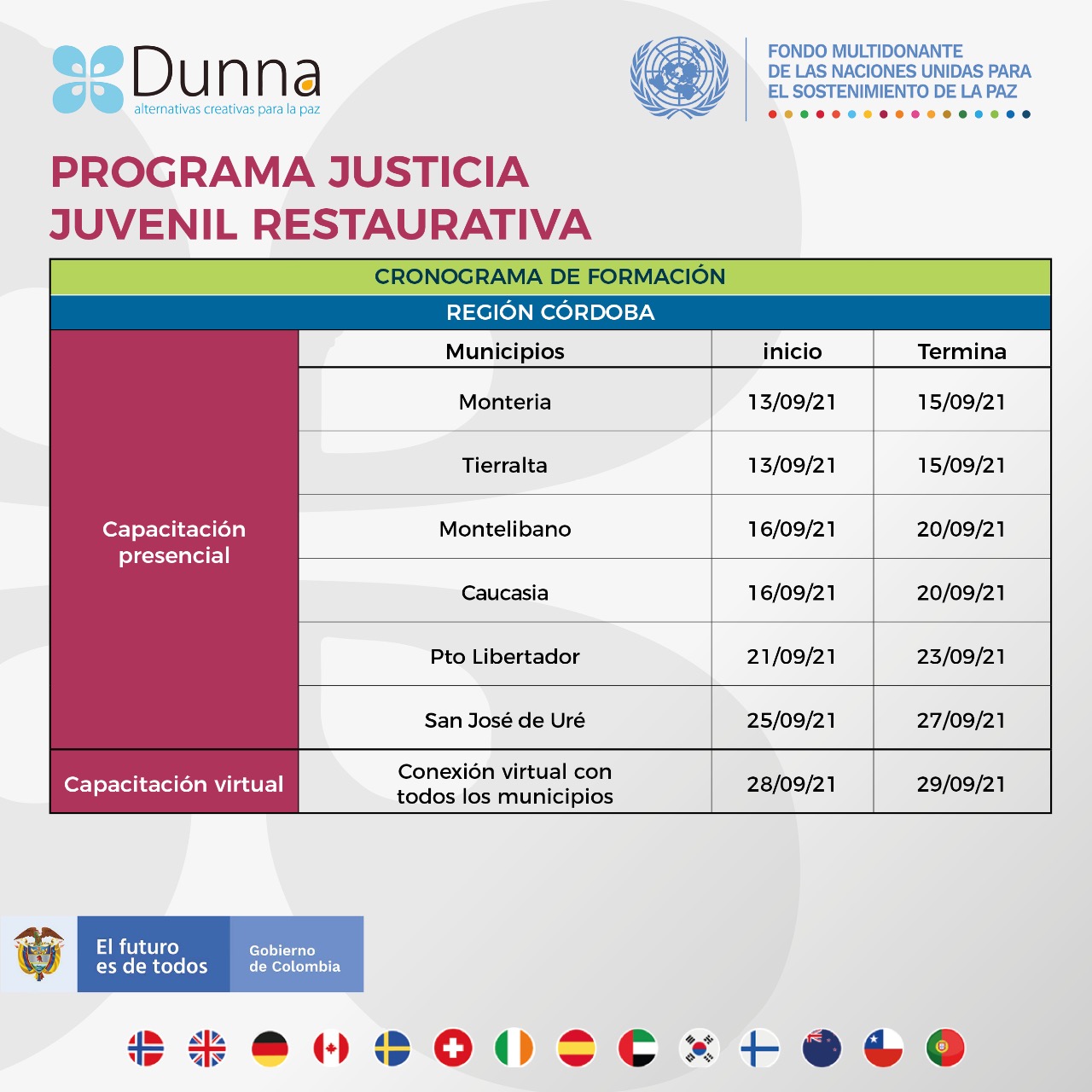Desde el Ministerio de Justicia y el Derecho (MJD), el Programa de las Naciones Unidas para el Desarrollo (PNUD), la Oficina de las Naciones Unidas contra la Droga y el Delito (UNODC) y la Corporación Dunna -alternativas creativas para la paz- les damos la bienvenida al Programa de Justicia Juvenil Restaurativa.