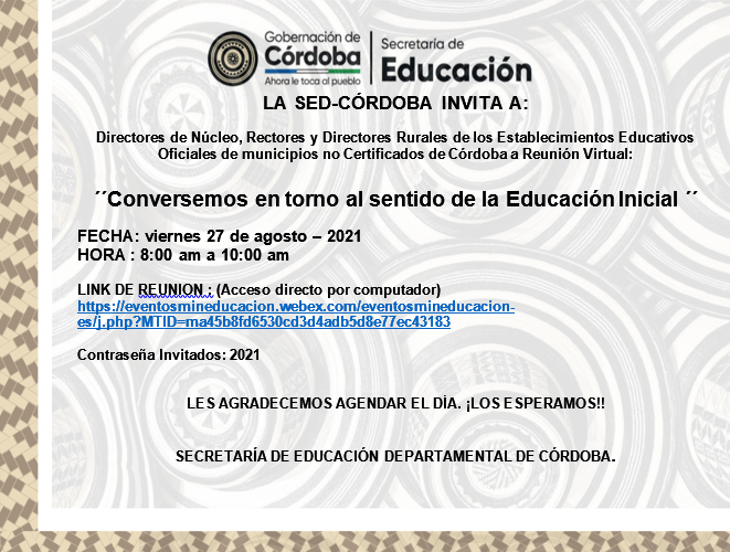 Directores de Núcleo, Rectores y Directores Rurales de los Establecimientos Educativos Oficiales de municipios no Certificados de Córdoba a Reunión Virtual:
