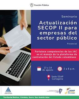 | Seminario PRESENCIAL en SECOP II y RUC dirigido a las JAC – Sede Cartagena Lugar de realización: Auditorio ESAP Cartagena Cierre de inscripciones: 13 agosto 2024 Inicio y fin de la capacitación: 13 y 14 agosto 2024 Hora: 2:00 PM – 6:00 PM |  |