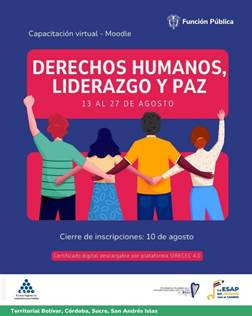 | Curso VIRTUAL sobre Derechos Humanos y Liderazgo para la Paz Intensidad horaria: 40 horas Lugar de realización: MOODLE - ESAP Cierre de inscripciones: 10 agosto 2024 Inicio y fin de la capacitación: Del 13 al 27 agosto 2024 |  |