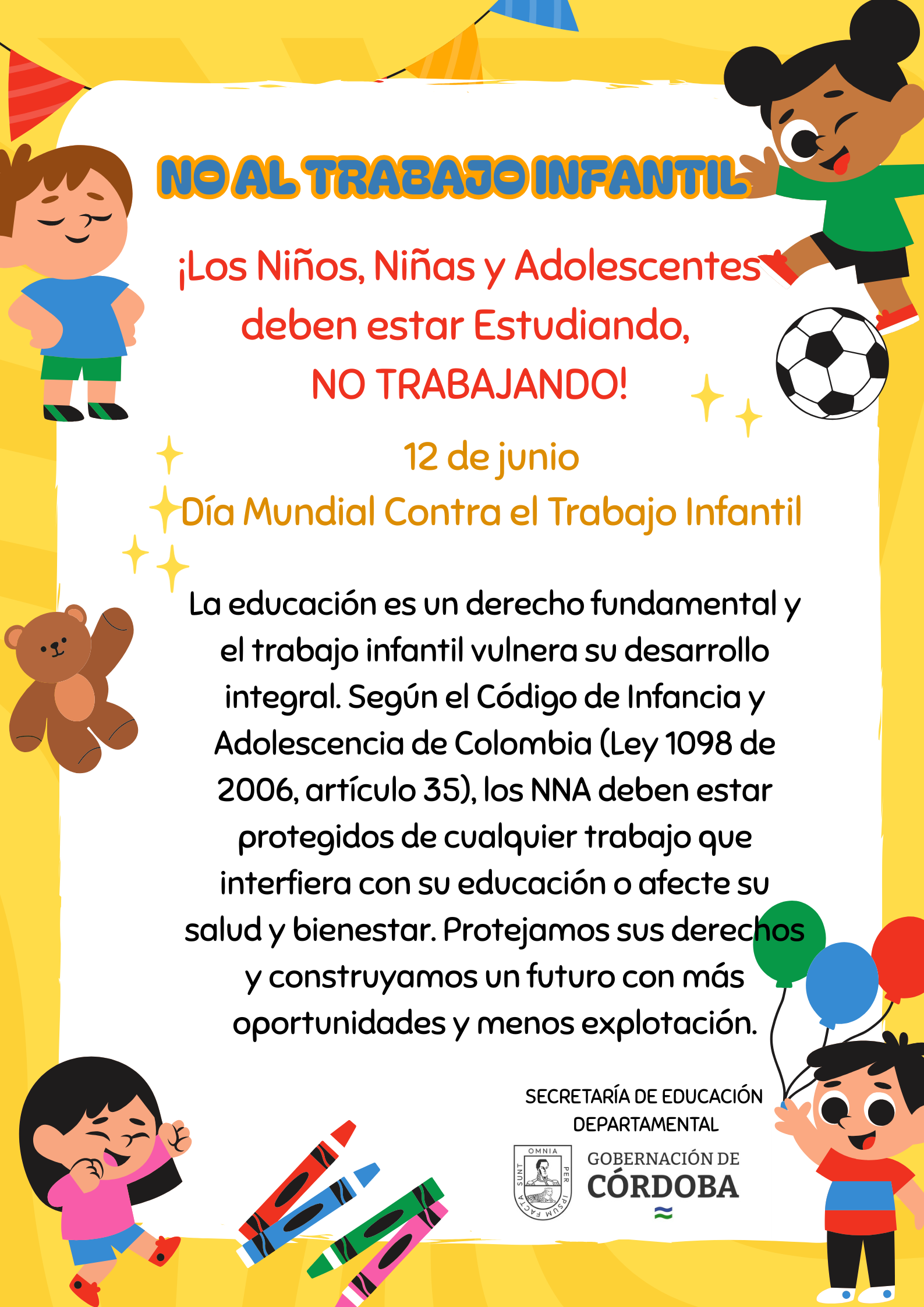 Desde la Gobernación de Córdoba a través de la Secretaría de Educación Departamental se reafirma el compromiso con la protección de los derechos de los niños, niñas y adolescentes con el deber de promover una infancia libre de trabajo infantil, enfocada en la educación, el bienestar y el desarrollo integral. Sigamos construyendo un futuro con más oportunidades y menos explotación.